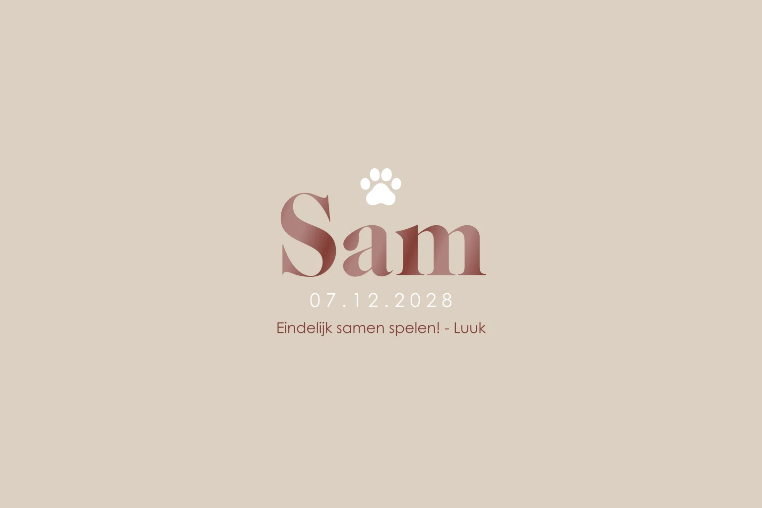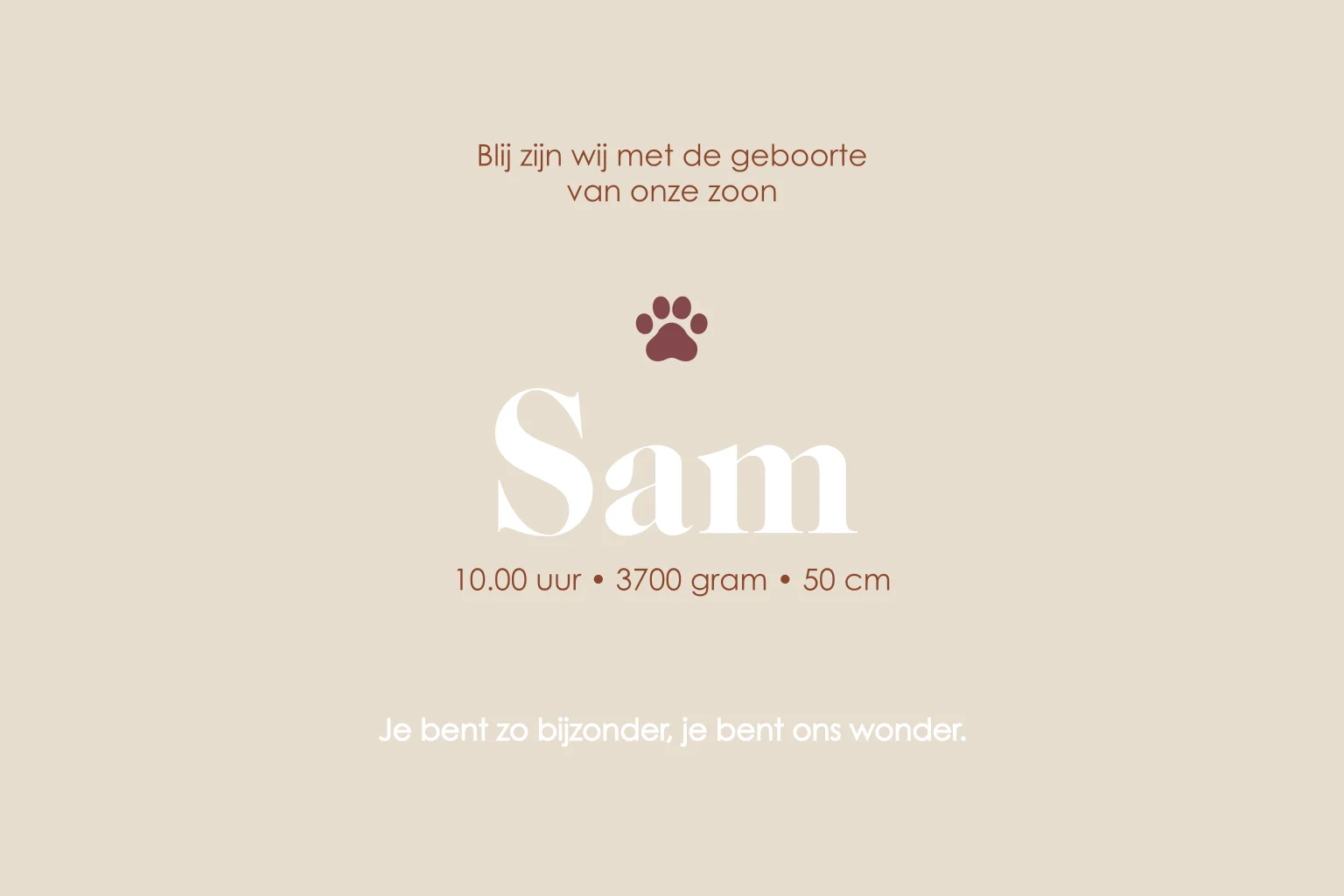 Een minimalistisch en lief geboortekaartje voor een jongen met een uitgestanste pootafdruk van huisdier in een zachte beige stijl. Pas het ontwerp eenvoudig aan naar eigen wens in onze online editor. Uit de speciale huisdieren collectie 'Thuis is met jou 🐾.
