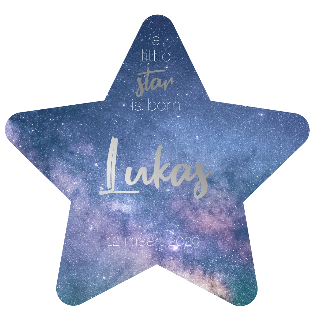 Geboortekaartje ster vorm met hippe galaxy achtergrond en foliedruk. (4183)