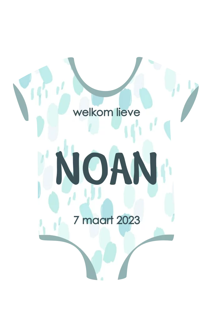 Geboortekaartje voor een jongen in de echte vorm van een romper met blauw-groene versiering. (4186)