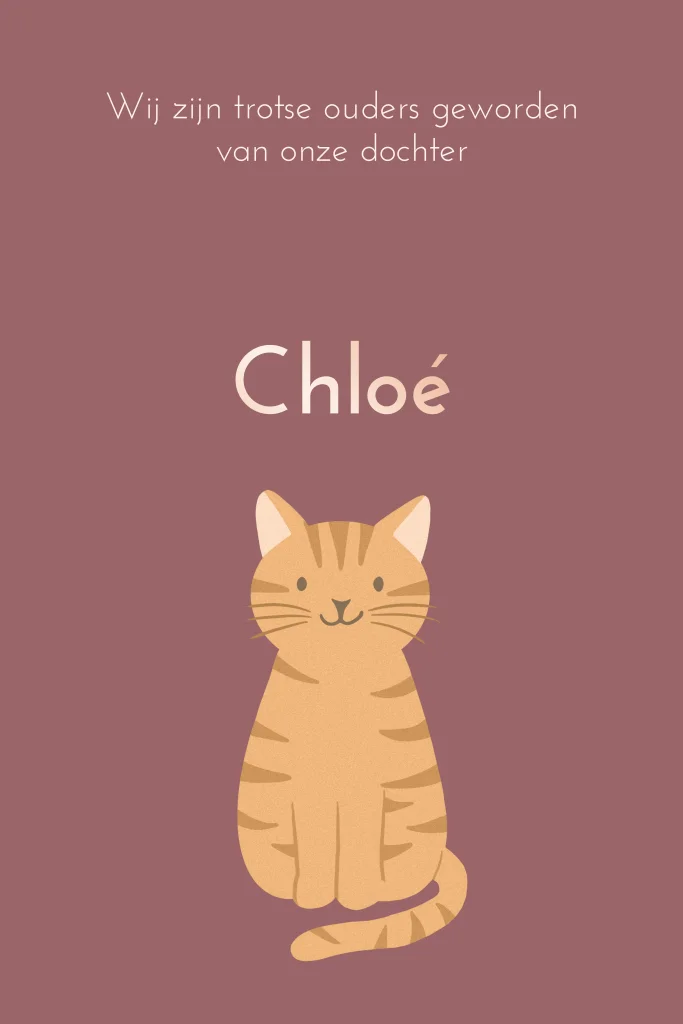 Een origineel geboortekaartje met een schattige huiskat en een speels doorkijkje in paarsβ en roze tinten. De bijzondere gestanste vorm geeft het kaartje een unieke uitstraling. Pas het ontwerp eenvoudig aan naar eigen wens in onze online editor. Uit de speciale huisdieren collectie 'Thuis is met jou πΎ.