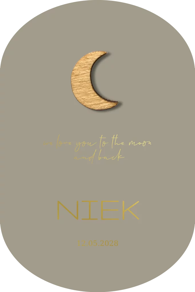 Jongens geboortekaartje in bijzondere vorm met écht maantje. Dit kaartje heeft een mooie ovalen vorm en plek voor een houten vormpje. Het houten maantje dien je los mee te bestellen bij je kaartjes.