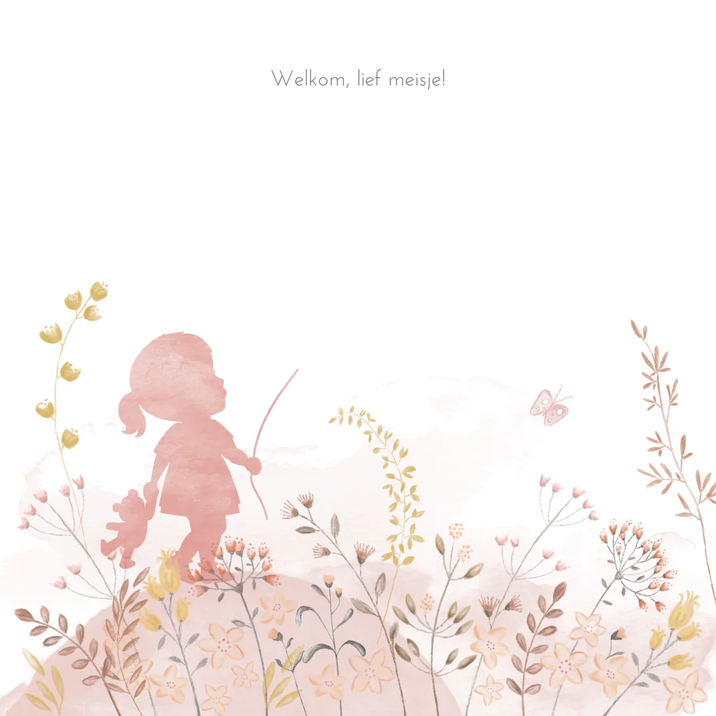 Dit mooie geboortekaartje voor een dochtertje heeft een rond doorkijkje waardoor de naam aan de binnenzijde zichtbaar wordt. Een schattig waterverf silhouet van een meisje met een beertje in haar hand temidden van een veld met getekende bloemetjes. Pas deze kaart eenvoudig aan naar eigen idee.