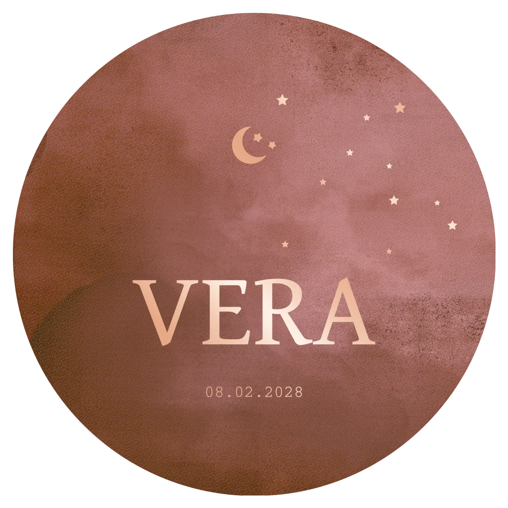 Een rond geboortekaartje voor een meisje met foliedruk maan en sterretjes op een warme achtergrond kleur.