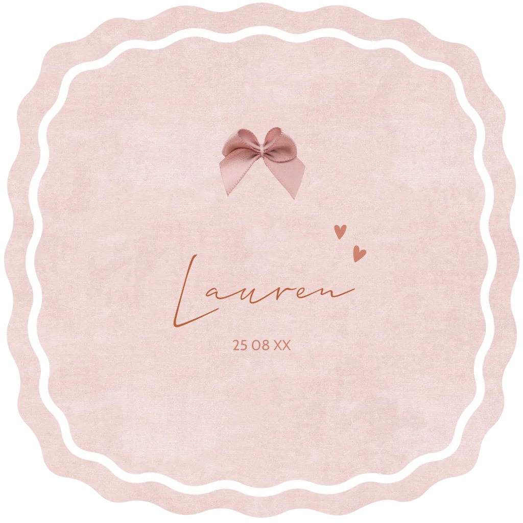 Dit lieve geboortekaartje is gestanst en heeft een schattig golvend randje en een velvet-look achtergrond. Bestel een los strikje om dit meisjeskaartje op te pimpen.