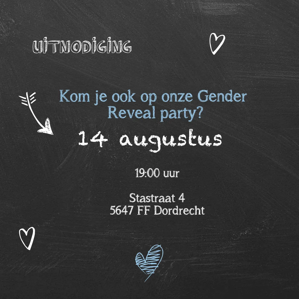 Uitnodiging Gender Reveal Party met stoere uitstraling. Met roze en blauwe hartjes op een krijtbord achtergrond.