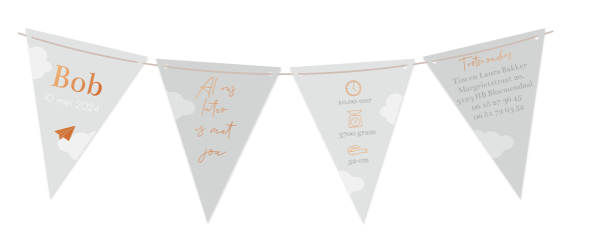 Geboortekaartje in de vorm van een slinger met vlaggetjes